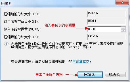 ∷在“压缩”对话框中输入需要减少的磁盘分区大小,然后单击“压缩”按钮,如图1-1所示: