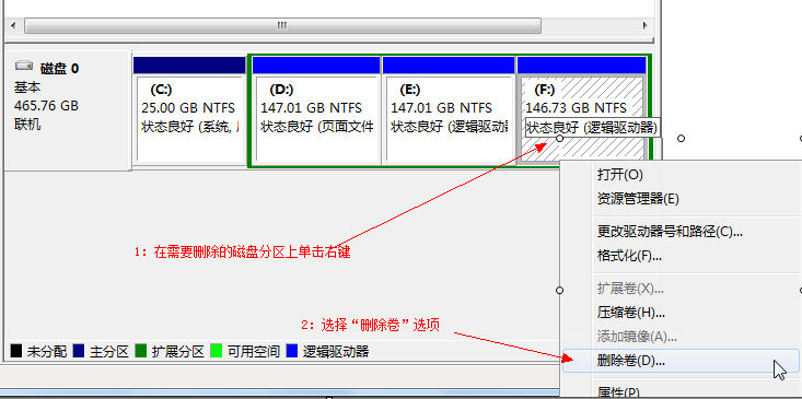 2:删除磁盘分区:在上述1的操作中打开所有磁盘,然后进行删除磁盘获得空间,具体操作,请参照下面图解: