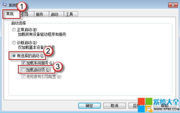 2.在“常规”选项卡上,单击“有选择的启动”,然后单击以清除“加载启动项”复选框。(“使用原有 Boot.ini”复选框不可用。)