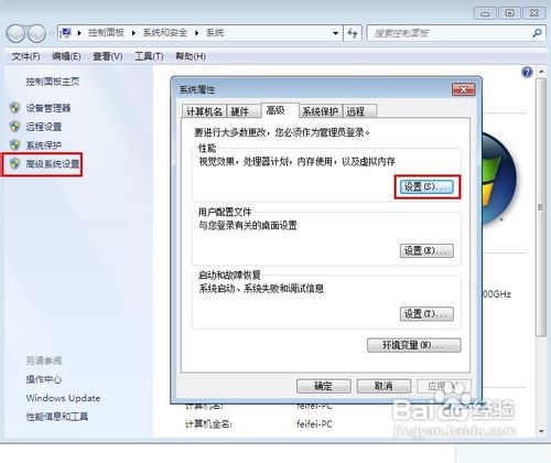 步骤2、在弹出的窗口中选择“高级系统设置”,然后点击“性能”这一栏中的“设置...”按钮。