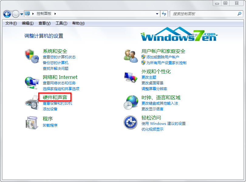 2、在打开的控制面板中,选择点击“硬件和声音”;如图2所示