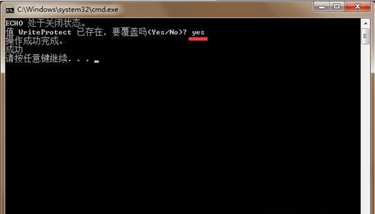 5、如果想要重新让u盘可以读取数据的话,只需将代码中的00000001改为00000000,点击打开修改后的文件,输入yes即可完成操作