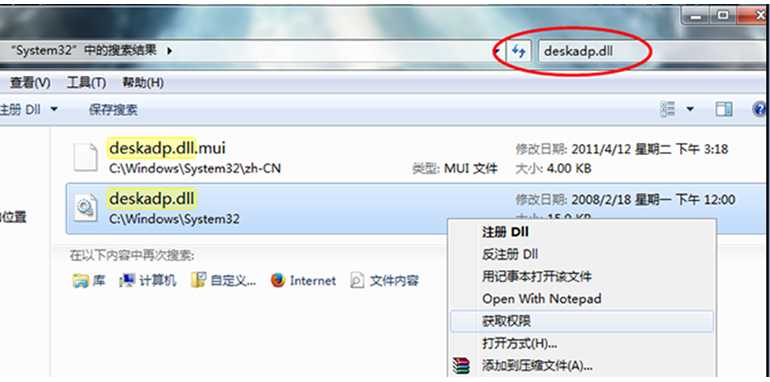 2.然后在计算机的“C:\Windows\System32”选项中,一一搜索3个分别为“deskadp.dll”跟“deskmon.dll”以及“deskperf.dll”称的文件,待搜索出结果后纷纷右击点选"获取权限"选项。