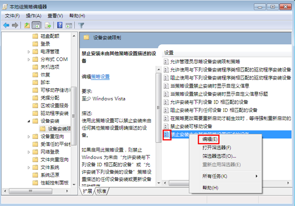 3.在右边打开的栏目中,右击“禁止安装未由其他策略设置描述的设备”,选择“编辑”