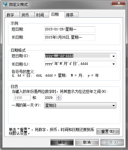 另外,windows7人性化地为我们提供了一种便捷的口语叫法,如“周一”“周二”...如果你更喜欢看到这样的显示方式,直接用‘ddd’代替上面提到的‘dddd’即可。而且你完全可以自由摆放星期几的显示位置,你可以将其摆放到日期格式最后面,也可以放到最前面完全没问题。