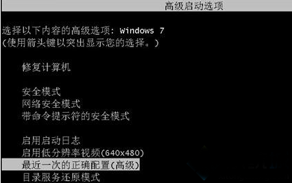 2、选定“最近一次的正确配置(高级)”项目,把系统还原到最近一次关机前的配置中;