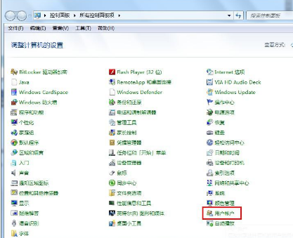 3.因为windows 7 远程桌面连接需要设置计算机密码,下面我们为计算机设置密码。点击控制面板,选择用户帐号打开。进入下一步