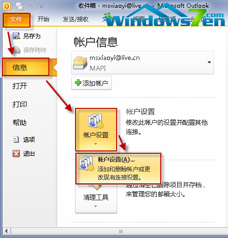 解决问题前,先了解一下你 Outlook 2010 邮箱服务器的类型。打开 Outlook, 单击“文件->信息->账户设置”。