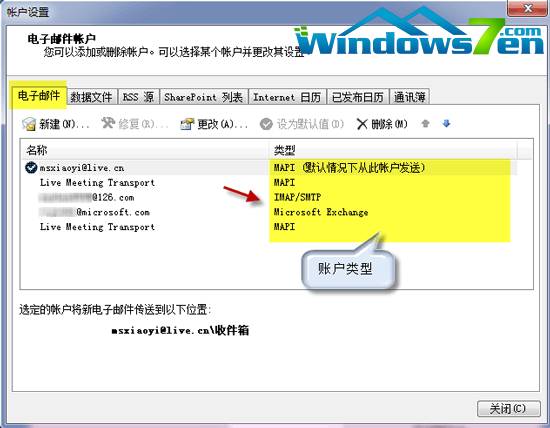 如下图所示,在“电子邮件”选项卡上,我们可以看到当前所有帐户的账户类型。