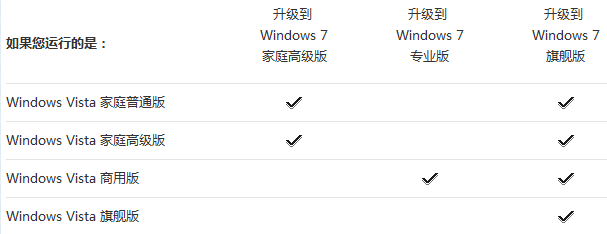 下表说明了哪些版本的 Windows Vista 可升级到 Windows 7。“升级”选项使用 Windows 7 的升级副本或者完整产品副本。此信息位于 Windows 7 零售版包装盒正面或联机销售回执上。