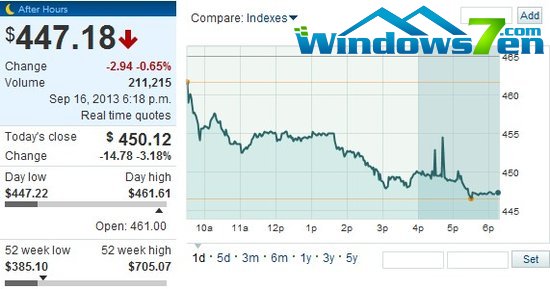受中国联通于周日晚宣布其iPhone 5S/5C 预约量突破 10 万部,逊于去年 iPhone 5 预售开始两天突破20 万部,以及分析师预计中国电信针对苹果iPhone 5S/5C 宣布的补贴大约要比iPhone 5 低出 15% 的影响,苹果股价周一在纳斯达克证券市场调控低开并逐级下滑,至收盘时,苹果股价下跌14.78 美元,跌幅为 3.18%,报收于 450.12 美元,市值蒸发了近140亿美元。