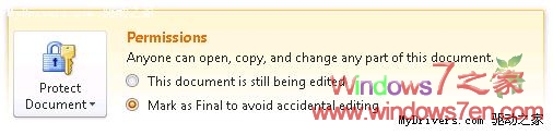 如果你想防止文档在意外情况下被修改但是又不阻止想要编辑该文档的人进行操作,那么你可以使用Mark as Final(标记为定稿)功能,选中该按钮即是该文档已经完成的标志,你的文档就只能进行只读操作,不过如果他人确定要对该文档进行修改那么他们也可以轻易更改设置。