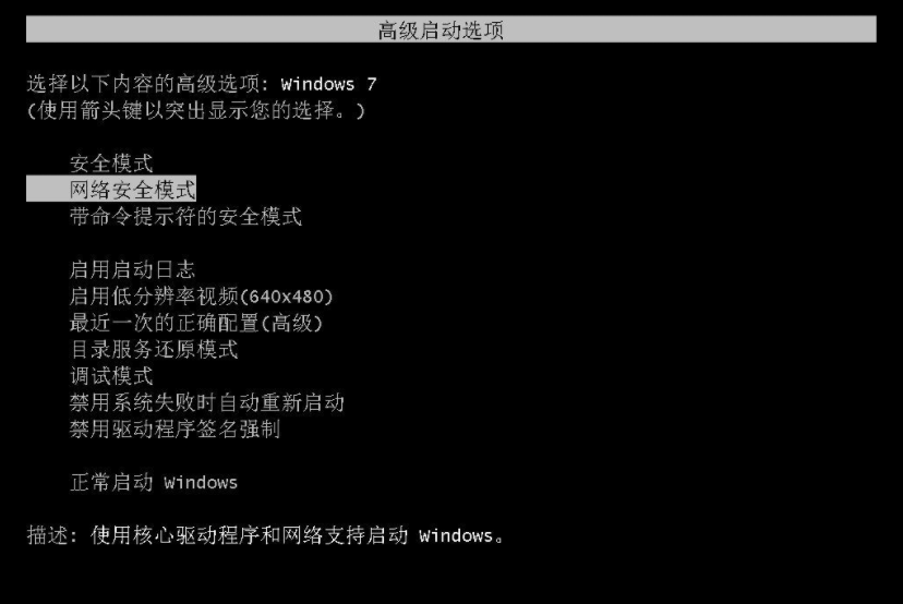 1、重启或开机时,在开机画面出现时不断的按下“F8”键,进入高级启动选项页面,使用上下方向键盘移动至“安全模式”,回车即可进入;