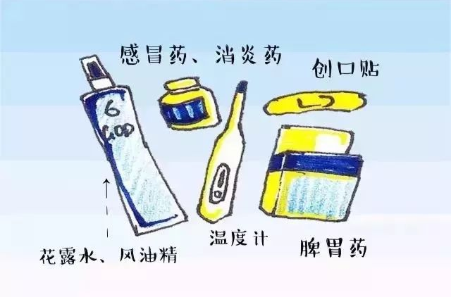 常用药品:治感冒、发烧、止痛的药;口罩、止血贴、棉签、体温计等,也可以选择到校后购买。