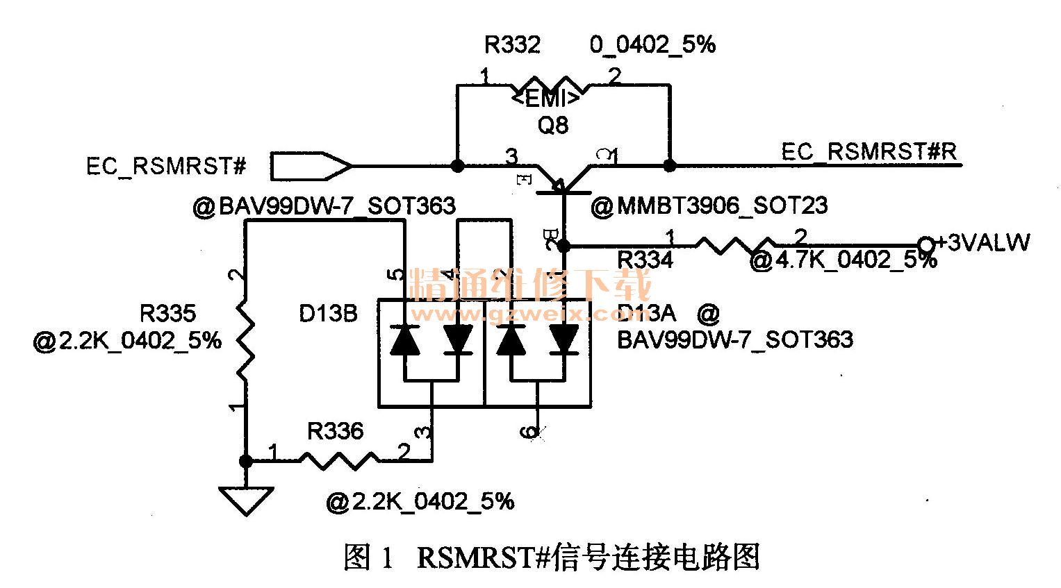 如图1所示为EC芯片与PCH芯片之间的RSMRST#信号连接电路图。检测时发现,该电路中的电子元器件性能良好,推测是EC芯片没有正常工作,所以RSMRST#信号没有正常发送。
