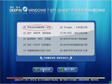 1、放入光碟,出现如下安装ghost win7系统界面,如图示选择第“1”项“安装系统到硬盘第一分区”。