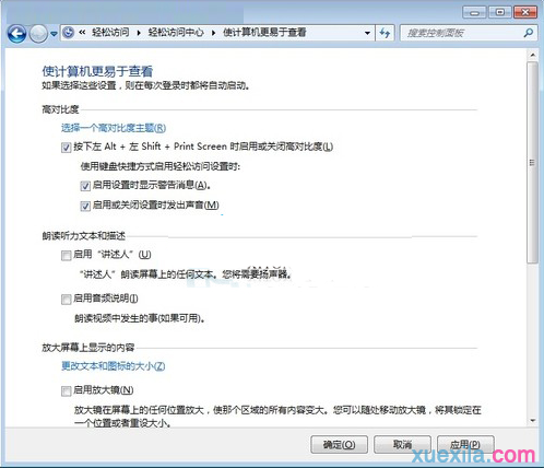 1、选用高对比度主题,可以使用按左Alt+左Shift+PrintScreen键启用或关闭高对比度;