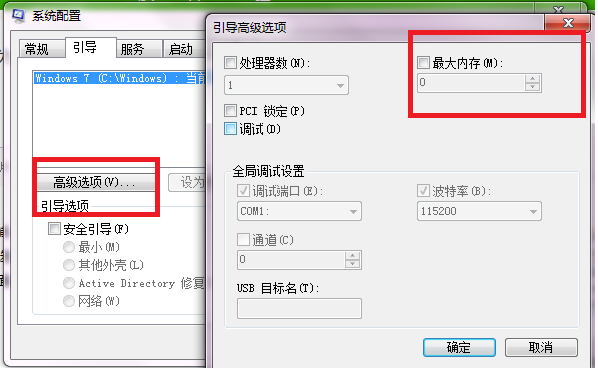 3.在“引导高级选项”里面去掉“处理器个数”和“最大内存”前面的对勾“√”,点击“确定”,重启计算机。