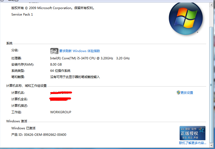 第十五步、再次在桌面右键“计算机”-“属性”查看,显示系统已经激活为正版,到此为止电脑重装系统圆满完成!