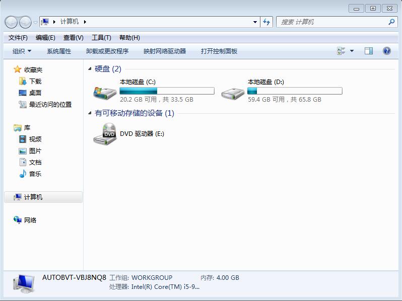 硬盘配置低或者损坏也会造成电脑频繁死机。我们要对硬盘进行修复:打开“计算机”,看到硬盘盘符。