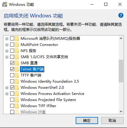 4、此时将弹出“Windows功能”窗口,从列表中选中“Telnet客户端”项,点击“确定”按钮。