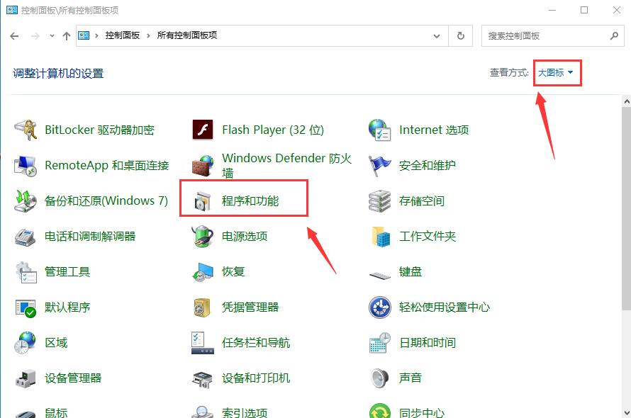 2、待打开“控制面板”窗口后,将“查看方式”设置为“大图标”,从工具列表中找到“程序和功能”按钮点击进入。