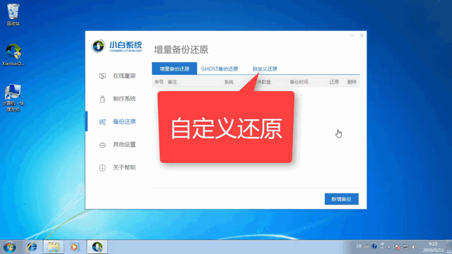 2、进入小白系统功能界面,选择备份还原,点击自定义还原。