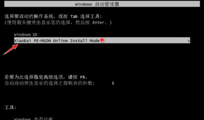 5、重启后选择 XiaoBai PE-MSDN Online Install Mode,然后按回车进入 Windows PE 系统。