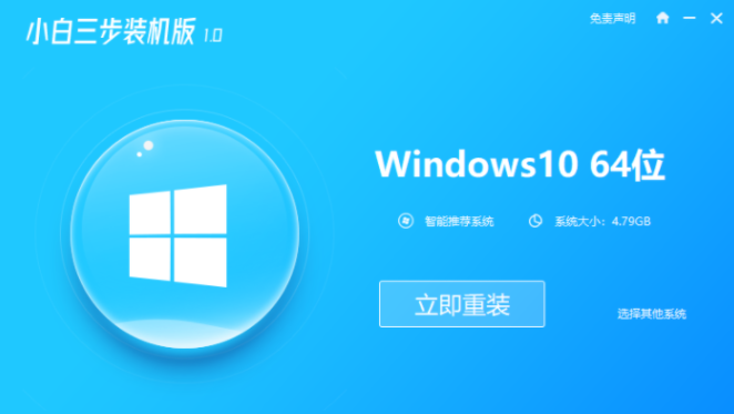 1、到小白官网(www.xiaobaixitong.com)下载小白三步装机版软件并打开,默认会推荐我们安装win10专业版,点击立即重装。提醒,重装建议退出安全软件。