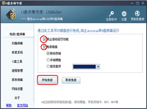 2、在项目栏上单击“免疫U盘病毒”选项。选中“禁止自动运行功能”和“免疫磁盘”,根据需要进行磁盘的选择,单击“开始免疫”,既可做到U盘病毒的免疫作用。拓展阅读:深度之家。