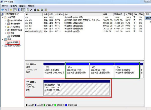 3、通常U盘插入电脑USB口后,在“我的电脑”中可以看到u盘,不过对于U盘分区表被严重破坏的情况,在“我的电脑”中看不到U盘,但是在磁盘管理器中可以看到。