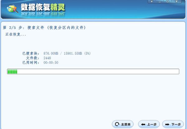 6、点击"下一步"按钮,数据恢复精灵就开始扫描U盘,开始实际的U盘数据恢复操作,并进入搜索文件界面.