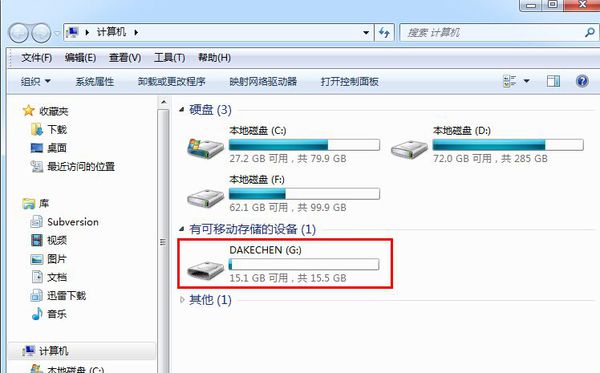 在“我的电脑”中,U盘被识别为可移动存储的设备。