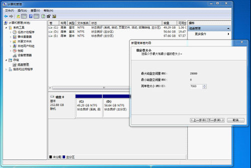 为Snow leopard准备磁盘空间的操作都可以在Windows系统自带的磁盘管理中完成。你可以进入控制面板——计算机管理——磁盘管理进行操作,windows7操作系统也可以直接在开始菜单的搜索栏里键入disk list进入磁盘管理。笔者这里是直接在原有的D盘上通过压缩卷的方式,挪出了30000M(约30GB)的磁盘空间,并将这一部分空间分成了7GB和23GB两个分区。其中,7GB分区用来存放snow leopard 安装文件,23GB分区用来作为snow leopard系统盘。完成后入下图所示: