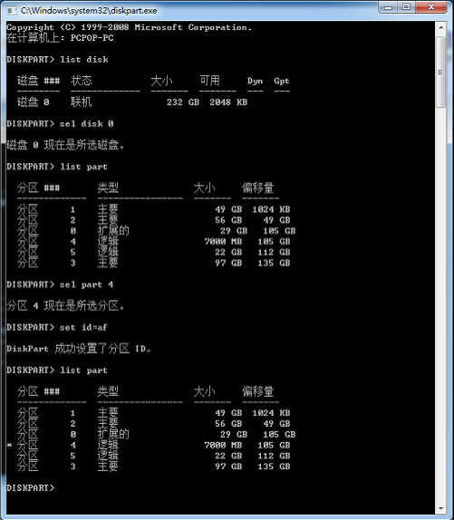 另外,如果Change Partition type to AF这里不成功,但进度完成了的话,你也可以尝试通过Windows 系统自带的Dispart对该分区手动指定AF标记,方法是运行Diskpart,通过sel part选择这个7GB分区,并执行命令Set ID=AF。其实在后面的引导过程中,如果发现Bootthink重启的话,也可以重新通过这个办法指定一次AF标记,因为Bootthink重启多半是因为找不到标记为AF的分区。