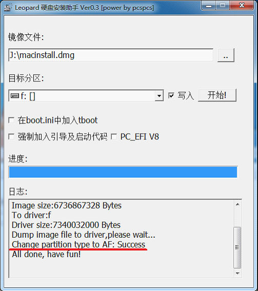 方法很简单,启动硬盘安装助手,在镜像文件一栏载入你刚才生成的新DMG文件,目标分区选择为Snow Leopard安装文件准备的7GB分区,然后将下面的三个复选框对钩去掉并点击写入。这时候有需要等待数分钟或10多分钟,仍然取决于你电脑的整体性能和磁盘性能。完成后确认一下日志列表中是否出现了Change Partition type to AF: success字样,这句话表示已经将该分区类型标记成AF标签,Mac OS X可以存取的分区。