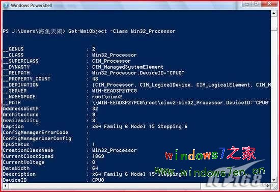 c获得BIOS信息 Get-WmiObject -Class Win32_BIOS可以获得真实的完整的系统BIOS的信息(如图6)。 d获得处理器信息 Get-WmiObject -Class Win32_Processor可以获得非常详尽的处理器的信息,再也不怕被JS欺骗了(如图7)。