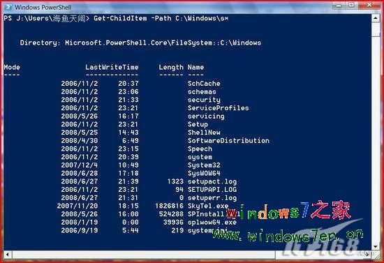 侧边栏里有了媒体中心 2.服务器级别的命令行工具 Vista的命令提示符比起Windows Server2008的PowerShell超级命令行工具是一种什么感觉呢?这种相形见拙的感觉估计你不安装Windows Server2008是无法体会到的。不过,微软已经把PowerShell超级命令行工具移植到了Windows7。下面,就让我们来体验下 PowerShell的超强能力吧。 a获得隐藏目录的所有文件列表 Get-ChildItem -Path C:\Windows -Force命令可以获得所有Windows目录下的所有的隐藏文件的输出列表(如图4)。