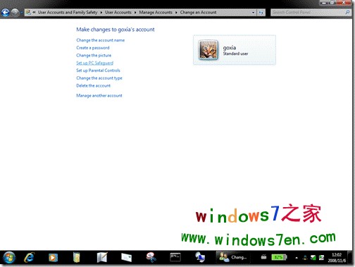 下面,我们就使用 PC Safeguard 来解决我们的后顾之忧。首先通过控制面板进入"User Accounts and Family Safety",并导航进入"Change an Account",单击"Set up PC Safeguard"。(图1)